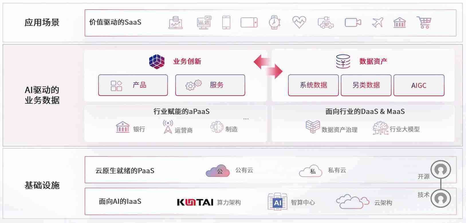 在基础设施层面,,基于商业或开源的云原生就绪开发工具与技术组件(PaaS)和面向AI的底层公共基础设施资源(IaaS),,将共同支撑企业完成数字化转型